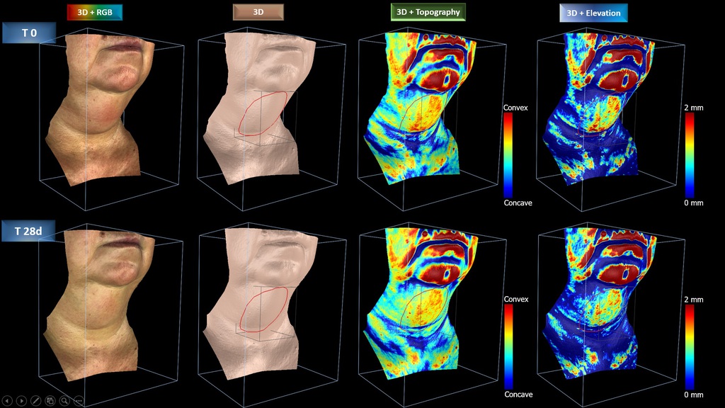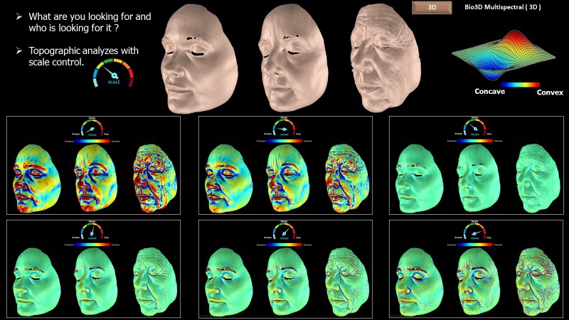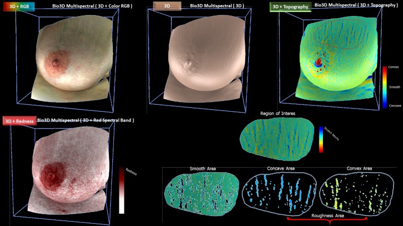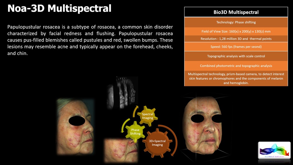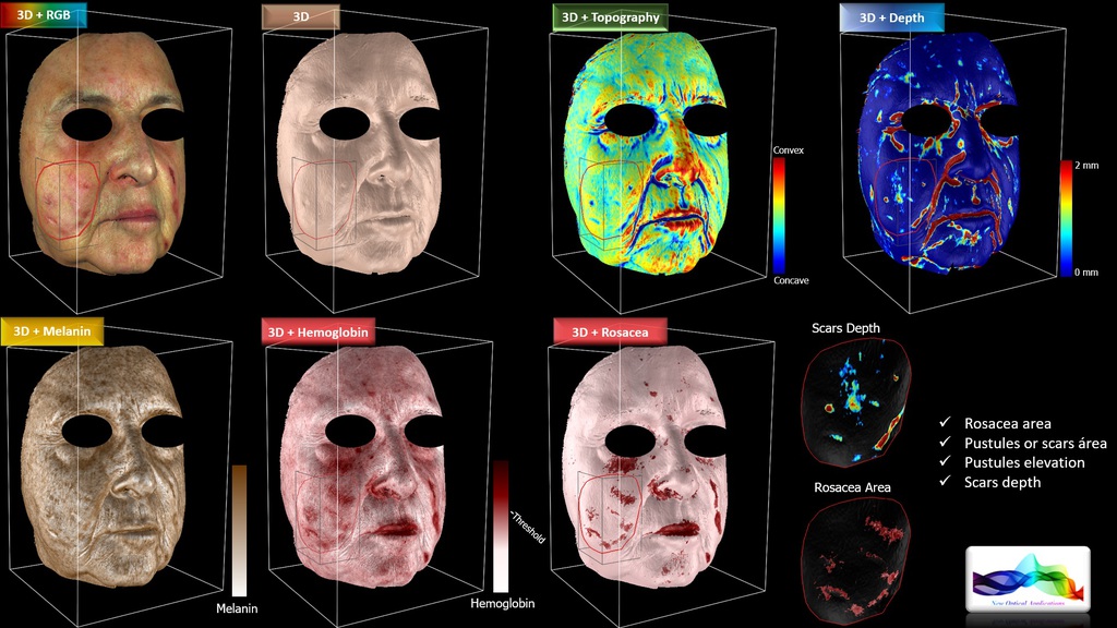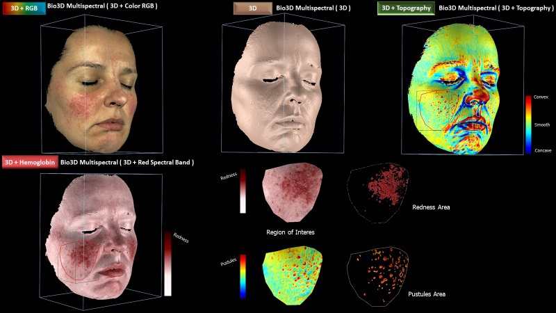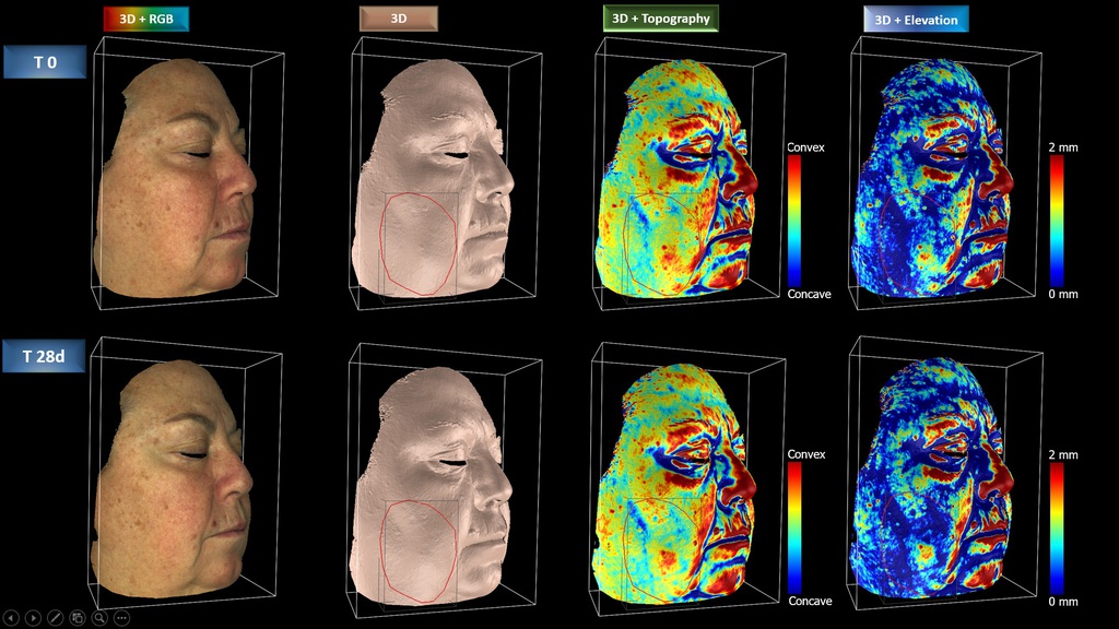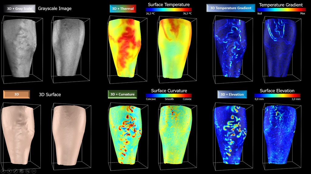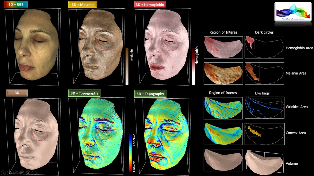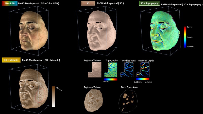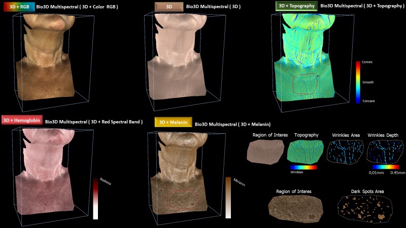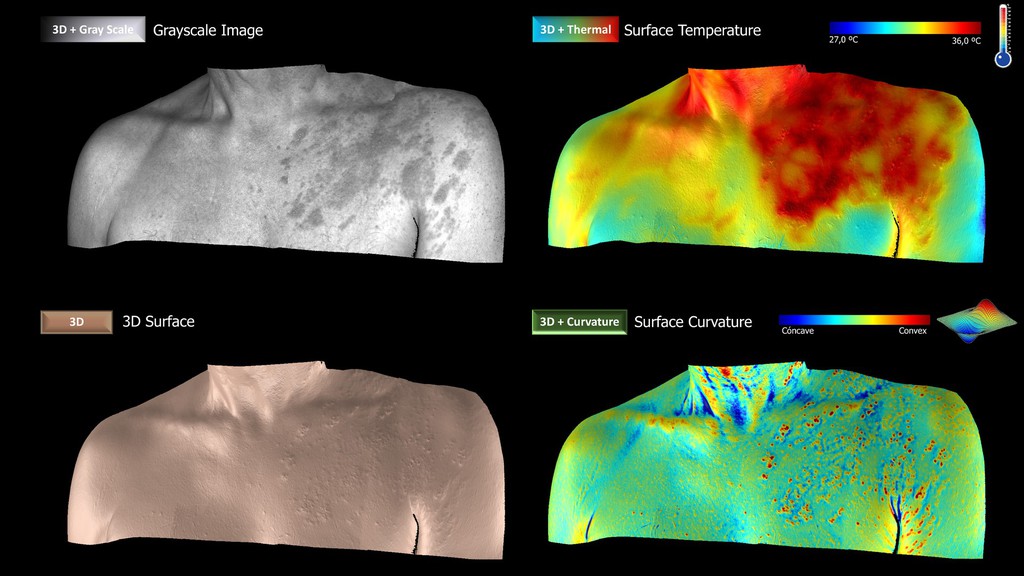 NOA3D with Multispectral Imaging allows us to assign relief to a 2D image or to assign spectral information to a 3D reconstruction. In this way we have at our disposal the possibility of selecting by ‘colour’ the presence of melanin and/or haemoglobin for subsequent quantification in the three-dimensional space or performing a topographical analysis of the object's surface to discriminate concave and convex regions for subsequent photometric quantification.