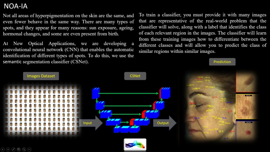 There are many types of spots and they appear for many reasons, exposure to the sun, with the passage of time, hormonal changes and we even have them from birth. At New Optical Applications, we are developing a convolutional neural network (CNN) that enables the automatic identification of different types of spots. To do this, we use the